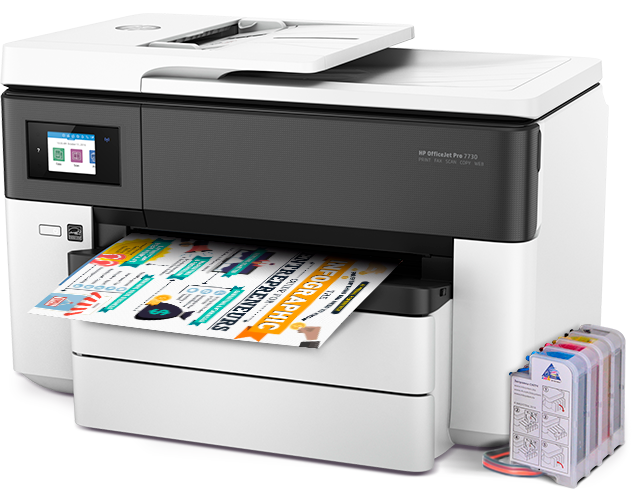 На рынке печатающей техники появилось новое устройство – HP OfficeJet Pro 7730. МФУ оснащено бесчиповой прошивкой. Отсутствие чипов дает возможность использовать совместимые чернила, что позволяет сократить расходы в несколько раз. При этом напечатанные материалы не отличаются по качеству и это никоим образом не влияет на стандартную работу принтера.