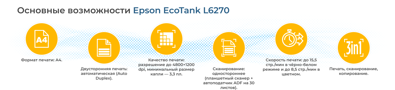 Epson EcoTank L6270 совмещает функции печати, сканирования и копирования, что делает его удобным решением для повседневных задач. Это модель формата A4 со встроенной системой непрерывной подачи чернил (СНПЧ), благодаря чему расходы на печать значительно ниже по сравнению с использованием картриджей. Устройство подойдёт для домашнего использования — печати учебных материалов, фотографий или документов, а также для малого и среднего бизнеса: бухгалтерий, офисов, образовательных центров. Благодаря надёжности и экономичности модель справляется с регулярными нагрузками и удобна в условиях многозадачности.