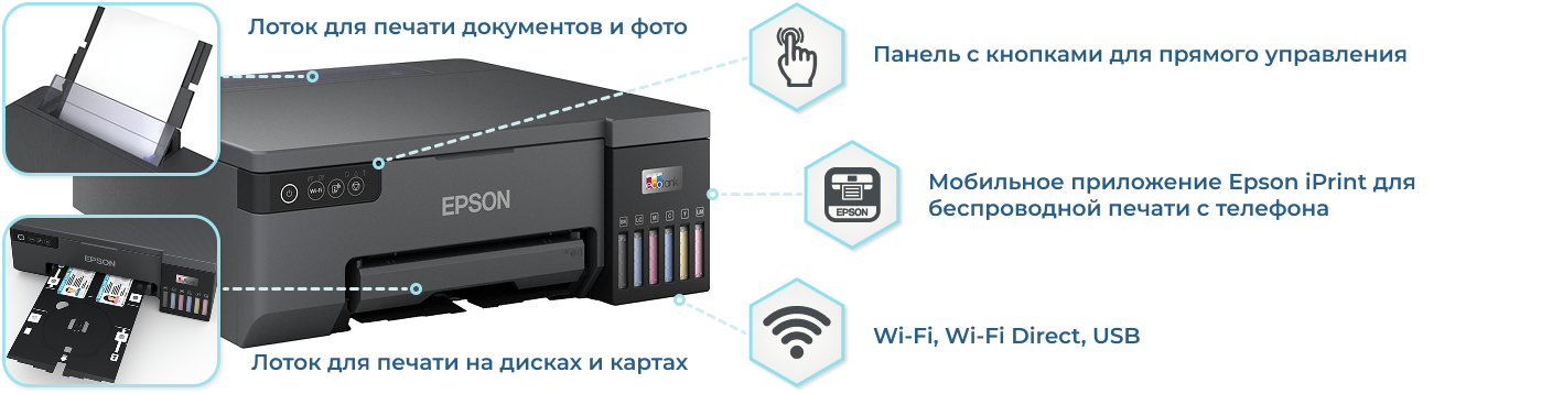 Беспроводные технологии – Wi-Fi, Wi-Fi Direct, поддержка Epson Smart Panel, Epson iPrint, Apple AirPrint для удобной печати со смартфонов и планшетов.
